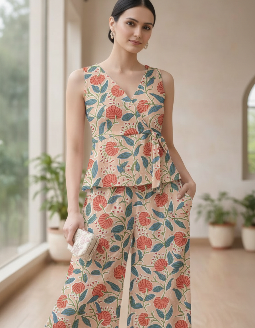 Women’s Peach Floral Pure Cotton Co-ord Set – Sleeveless V-Neck...