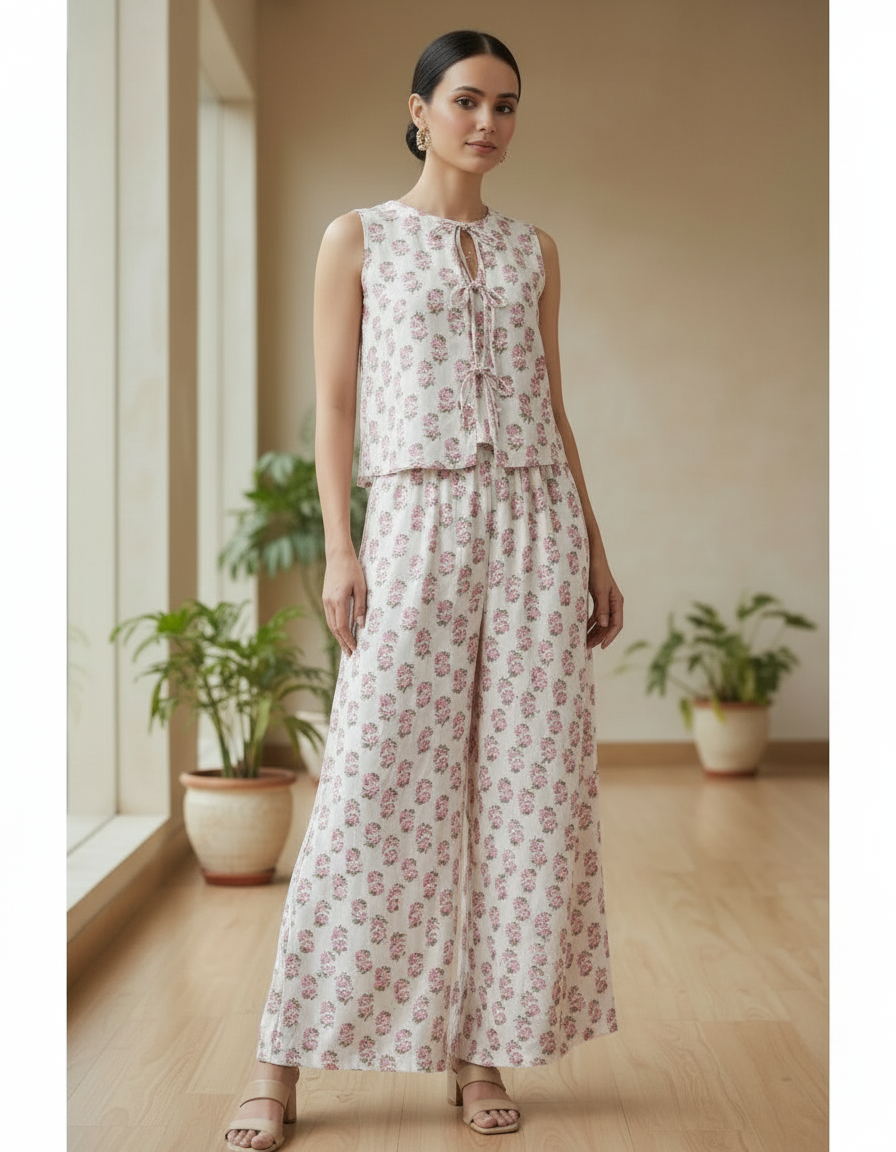Women’s White Floral Pure Cotton Co-ord Set – Sleeveless Tie-Up...
